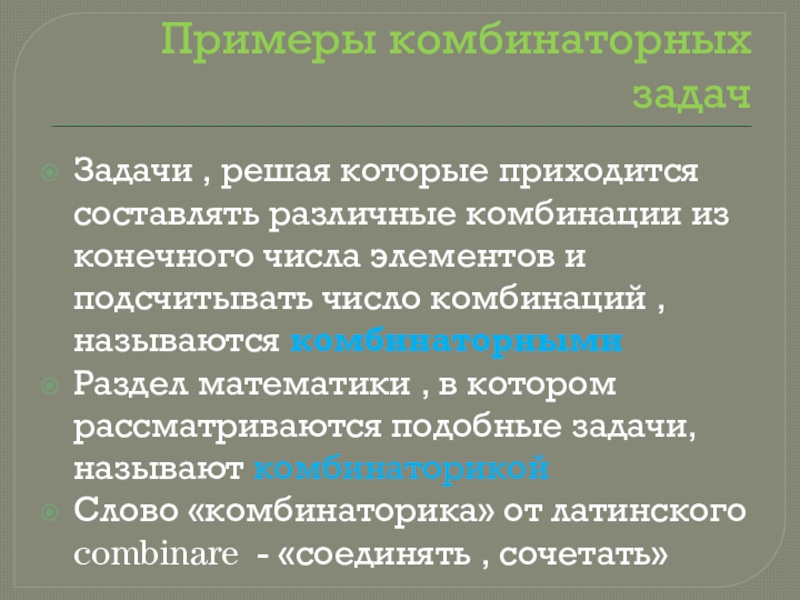 Слово «комбинаторика» от латинского combinare - «соединять , сочетать»
