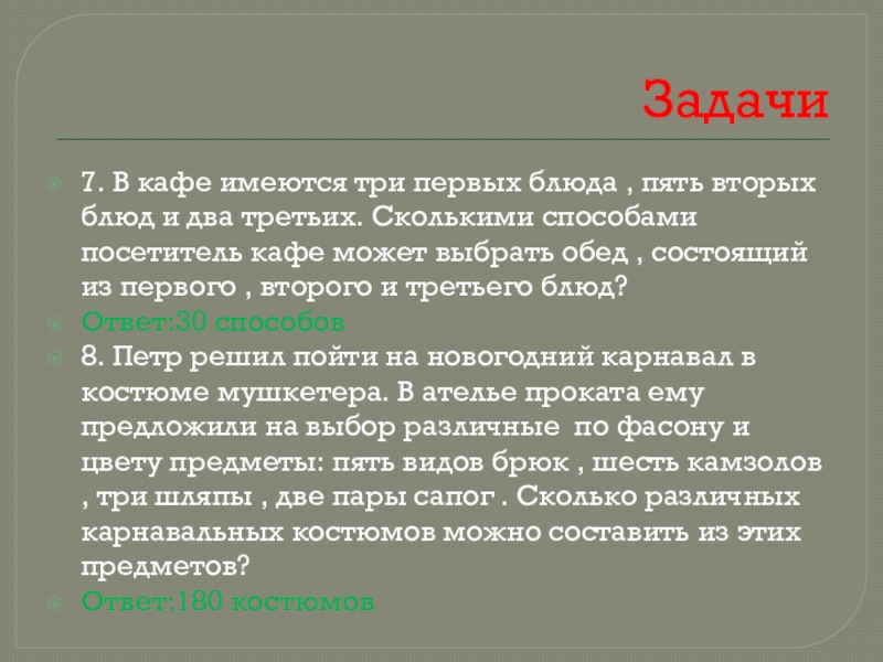 8. Петр решил пойти на новогодний карнавал в костюме мушкетера. В ателье проката ему предложили на выбор различные по фасону и цвету предметы: пять видов брюк , шесть камзолов , три шляпы , две пары сапог . Сколько различных карнавальных костюмов можно составить из этих предметов?