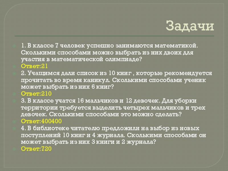 2. Учащимся дали список из 10 книг , которые рекомендуется прочитать во время каникул. Сколькими способами ученик может выбрать из них 6 книг?