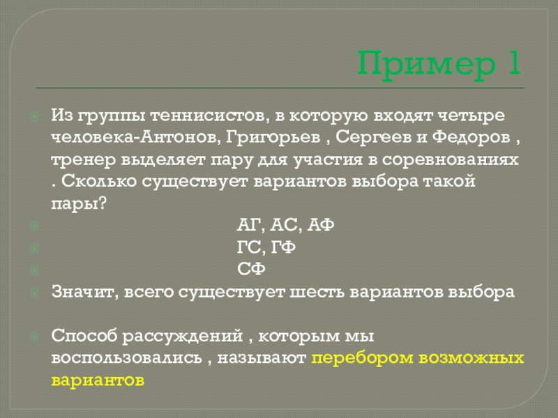 Способ рассуждений , которым мы воспользовались , называют перебором возможных вариантов