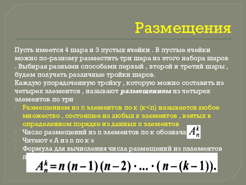 Размещением из n элементов по к (кЧисло размещений из n элементов по к обозначают