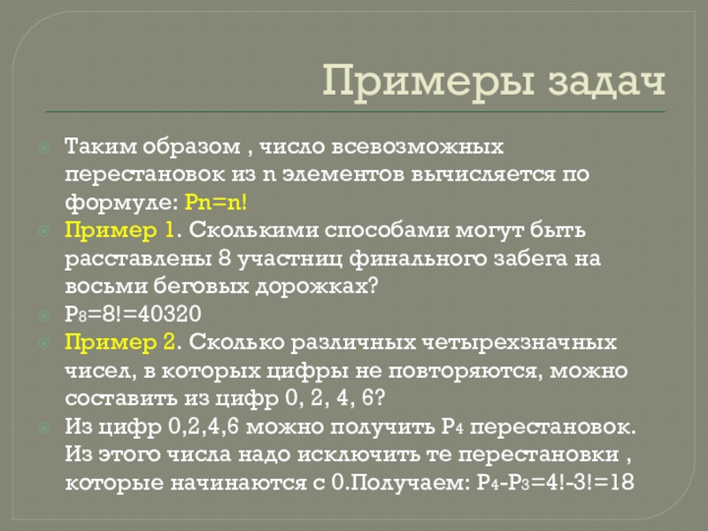 Пример 1. Сколькими способами могут быть расставлены 8 участниц финального забега на восьми беговых дорожках?