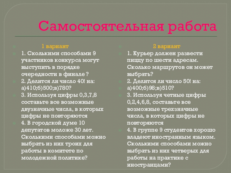 1. Курьер должен развести пиццу по шести адресам. Сколько маршрутов он может выбрать?