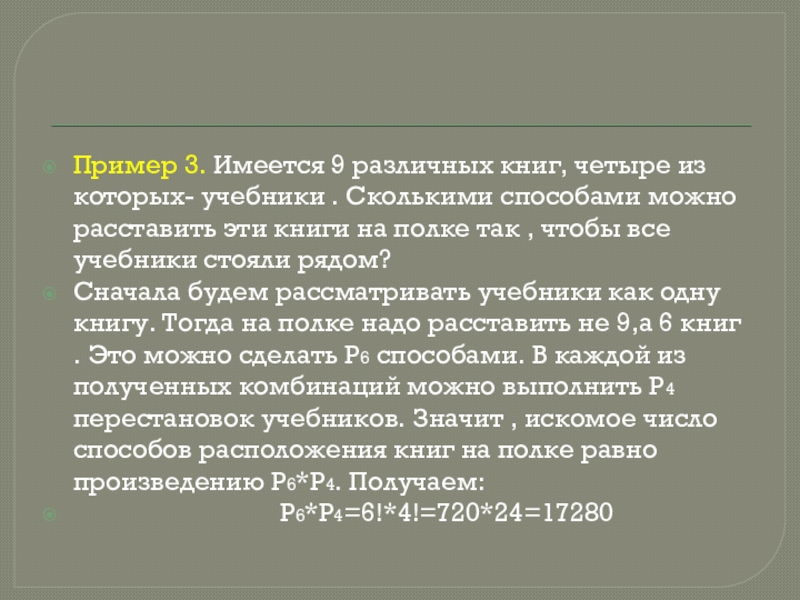 Сначала будем рассматривать учебники как одну книгу. Тогда на полке надо расставить не 9,а 6 книг . Это можно сделать Р6 способами. В каждой из полученных комбинаций можно выполнить Р4 перестановок учебников. Значит , искомое число способов расположения книг на полке равно произведению Р6*Р4. Получаем: