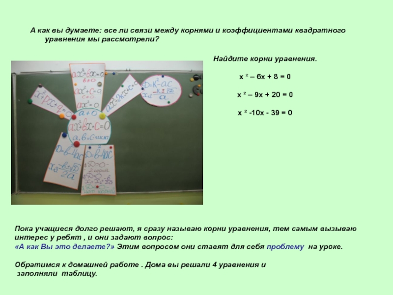 Пока учащиеся долго решают, я сразу называю корни уравнения, тем самым вызываю интерес у ребят , и они задают вопрос:
