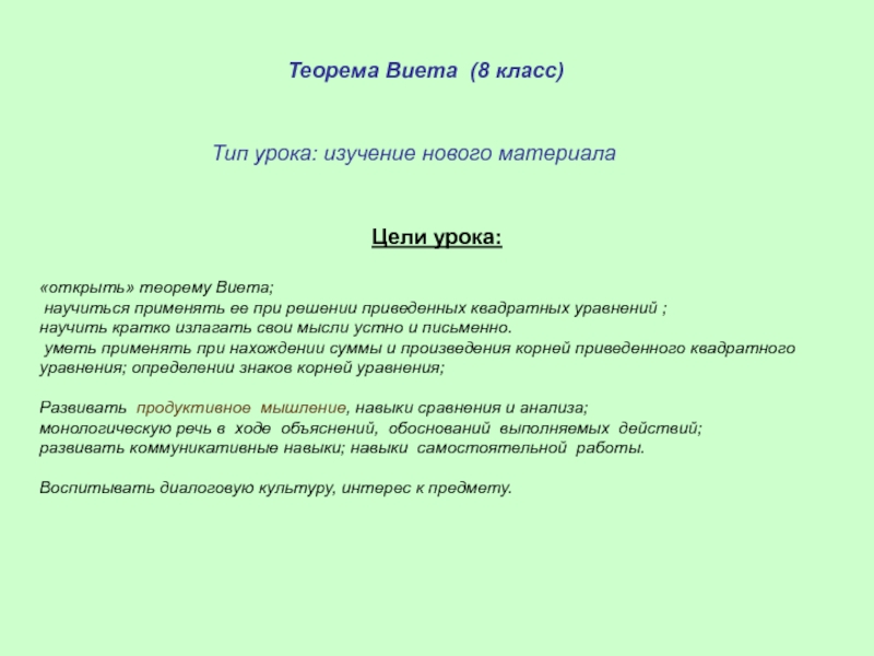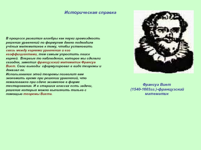 В процессе развития алгебры как науки громоздкость решения уравнений по формулам давно подводила учёных математиков к тому, чтобы установить связь между корнями уравнения и его коэффициентами, тем самым упростить поиск корней. Впервые то наблюдение, которое мы сделали сегодня, заметил французский математик Франсуа Виет. Свои выводы сформулировал в виде теоремы и доказал ее.