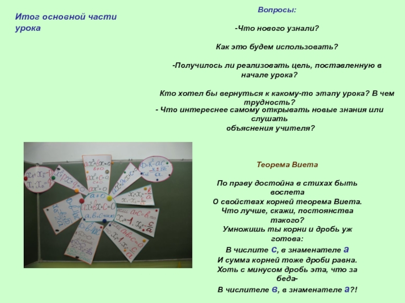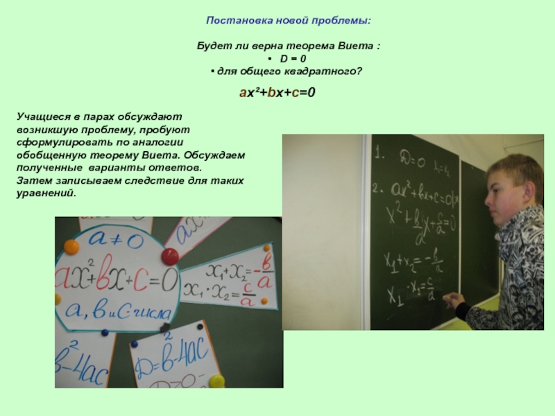 Учащиеся в парах обсуждают возникшую проблему, пробуют сформулировать по аналогии обобщенную теорему Виета. Обсуждаем полученные варианты ответов.