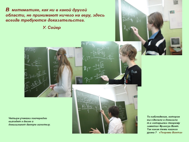 Четыре ученика поочередно выходят к доске и доказывают данную гипотезу.