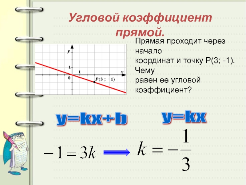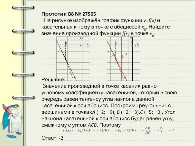 Значение производной в точке касания равно угловому коэффициенту касательной, который в свою очередь равен тангенсу угла наклона данной касательной к оси абсцисс. Построим треугольник с вершинами в точках A (1; 2), B (1; −4), C(−2; −4). Угол наклона касательной к оси абсцисс будет равен углу ACB