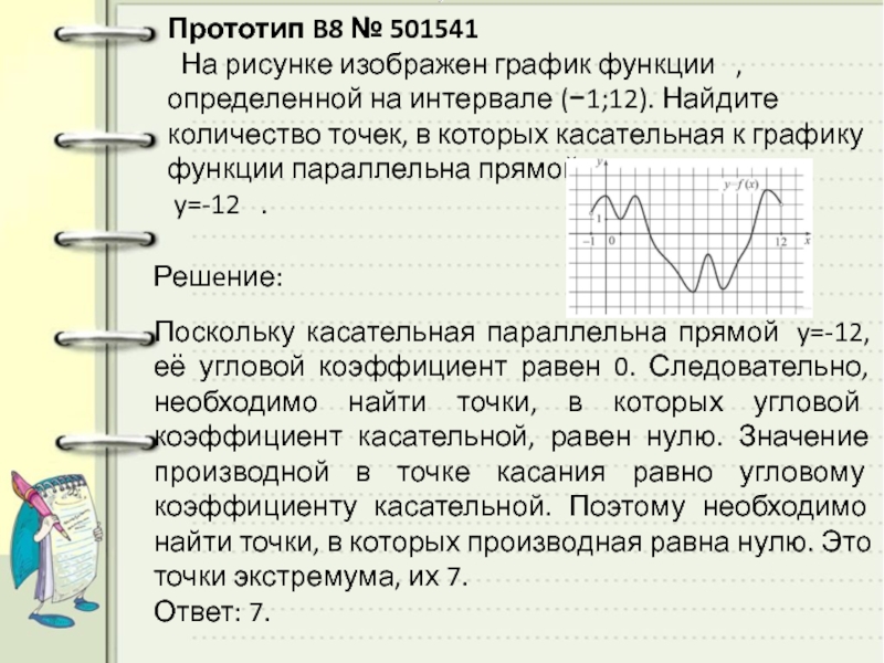 Поскольку касательная параллельна прямой y=-12, её угловой коэффициент равен 0. Следовательно, необходимо найти точки, в которых угловой коэффициент касательной, равен нулю. Значение производной в точке касания равно угловому коэффициенту касательной. Поэтому необходимо найти точки, в которых производная равна нулю. Это точки экстремума, их 7.