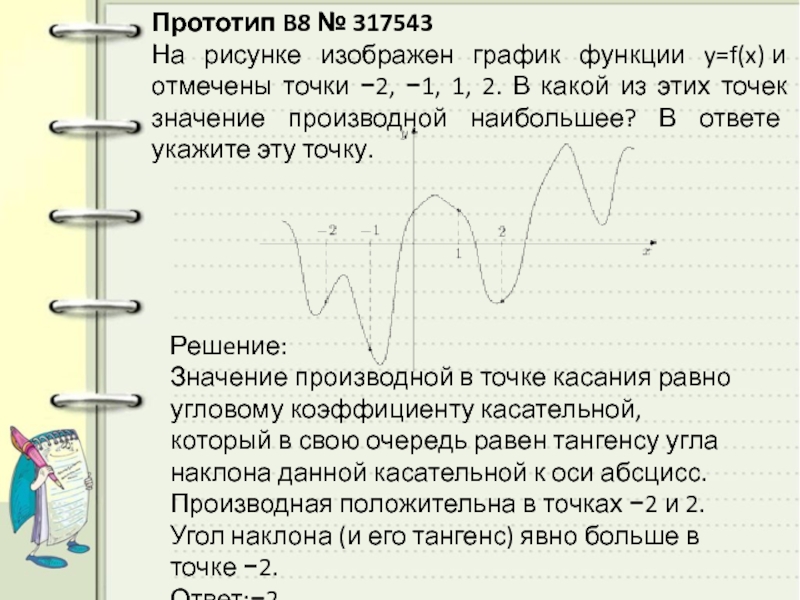 Значение производной в точке касания равно угловому коэффициенту касательной, который в свою очередь равен тангенсу угла наклона данной касательной к оси абсцисс. Производная положительна в точках −2 и 2. Угол наклона (и его тангенс) явно больше в точке −2.