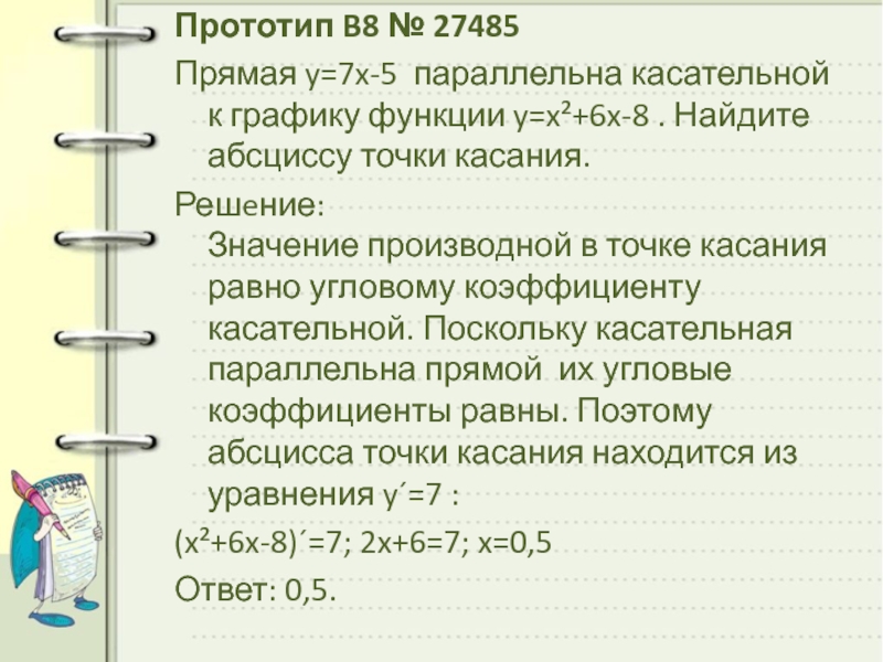Значение производной в точке касания равно тангенсу угла наклона касательной к оси абсцисс. Построим треугольник с вершинами в точках A(5;8), B(5;-2) и C(0;-2). Угол ACB равен углу наклона касательной. Его тангенс равен отношению противолежащего катета к прилежащему:
