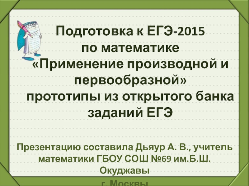 Презентацию составила Дьяур А. В., учитель математики ГБОУ СОШ №69 им.Б.Ш.Окуджавы