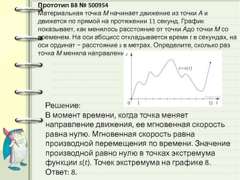 В момент времени, когда точка меняет направление движения, ее мгновенная скорость равна нулю. Мгновенная скорость равна производной перемещения по времени. Значение производной равно нулю в точках экстремума функции s(t). Точек экстремума на графике 8.