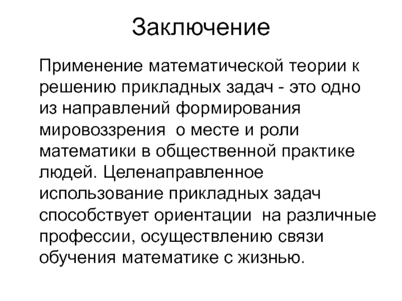 одно из направлений формирования мировоззрения о месте и роли математики в общественной практике людей. Целенаправленное использование прикладных задач способствует ориентации на различные профессии, осуществлению связи обучения математике с жизнью.