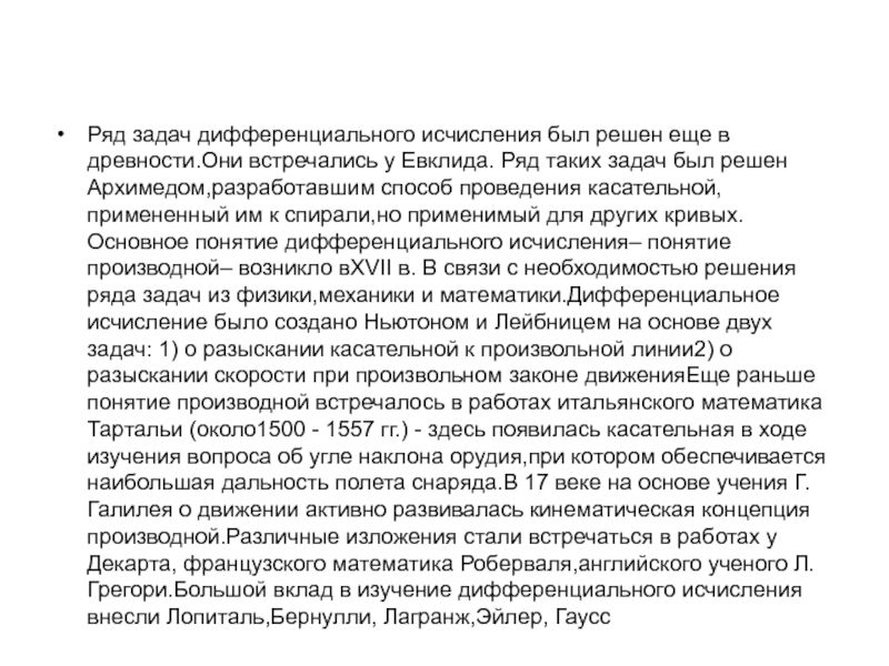 Евклида. Ряд таких задач был решен Архимедом,разработавшим способ проведения касательной,примененный им к спирали,но применимый для других кривых. Основное понятие дифференциального исчисления– понятие производной– возникло вXVII в. В связи с необходимостью решения ряда задач из физики,механики и математики.Дифференциальное исчисление было создано Ньютоном и Лейбницем на основе двух задач: 1) о разыскании касательной к произвольной линии2) о разыскании скорости при произвольном законе движенияЕще раньше понятие производной встречалось в работах итальянского математика Тартальи (около1500 - 1557 гг.) - здесь появилась касательная в ходе изучения вопроса об угле наклона орудия,при котором обеспечивается наибольшая дальность полета снаряда.В 17 веке на основе учения Г.Галилея о движении активно развивалась кинематическая концепция производной.Различные изложения стали встречаться в работах у Декарта, французского математика Роберваля,английского ученого Л. Грегори.Большой вклад в изучение дифференциального исчисления внесли Лопиталь,Бернулли, Лагранж,Эйлер, Гаусс