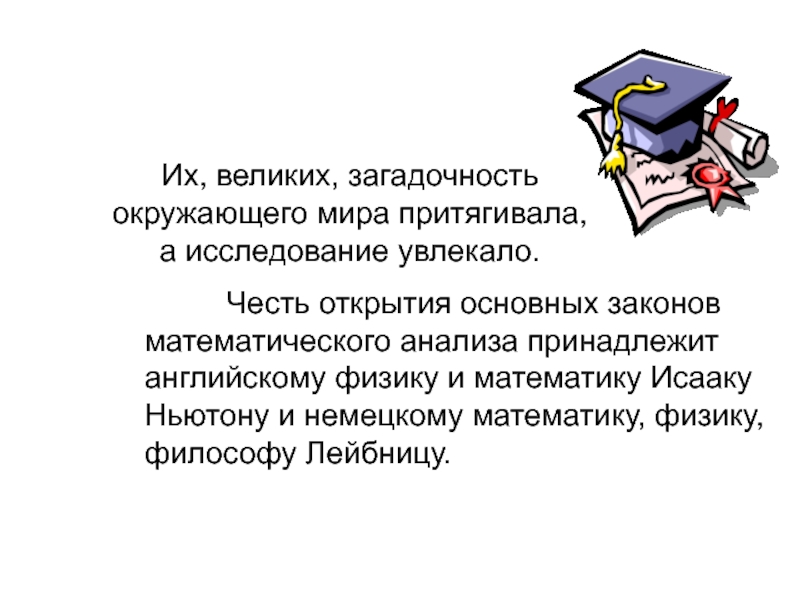 математического анализа принадлежит английскому физику и математику Исааку Ньютону и немецкому математику, физику, философу Лейбницу.