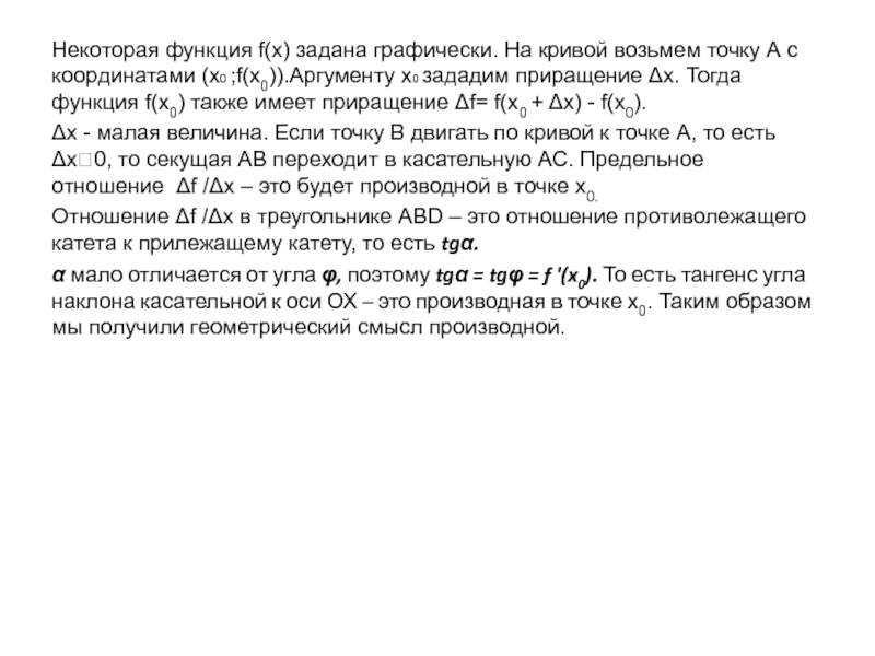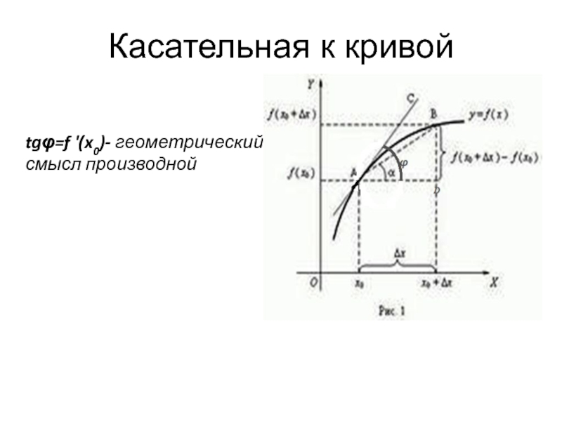 Δх - малая величина. Если точку В двигать по кривой к точке А, то есть Δх?0, то секущая АВ переходит в касательную АС. Предельное отношение Δf /Δх – это будет производной в точке x0.