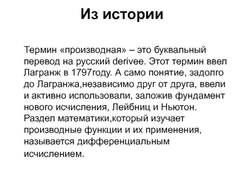 термин ввел Лагранж в 1797году. А само понятие, задолго до Лагранжа,независимо друг от друга, ввели и активно использовали, заложив фундамент нового исчисления, Лейбниц и Ньютон. Раздел математики,который изучает производные функции и их применения, называется дифференциальным исчислением.