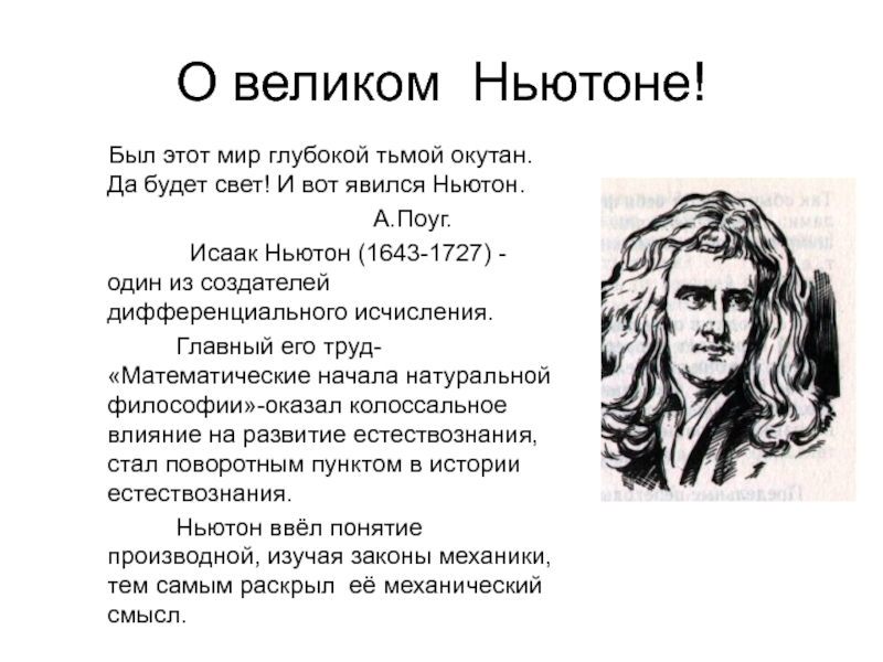 Ньютон ввёл понятие производной, изучая законы механики, тем самым раскрыл её механический смысл.