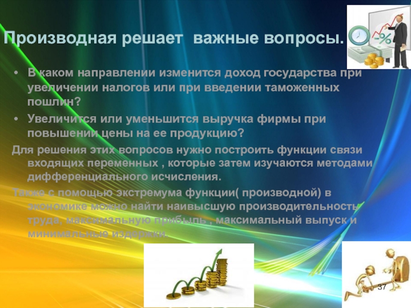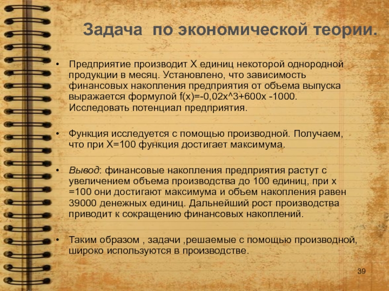 Также с помощью экстремума функции( производной) в экономике можно найти наивысшую производительность труда, максимальную прибыль , максимальный выпуск и минимальные издержки.