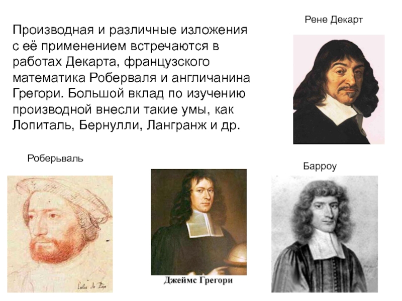 Декарта, французского математика Роберваля и англичанина Грегори. Большой вклад по изучению производной внесли такие умы, как Лопиталь, Бернулли, Лангранж и др.