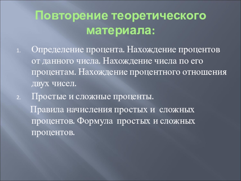 В теоретическом плане методы решения основных задач на проценты представляют собой самостоятельный фрагмент математической теории, имеющий небольшую сложность.