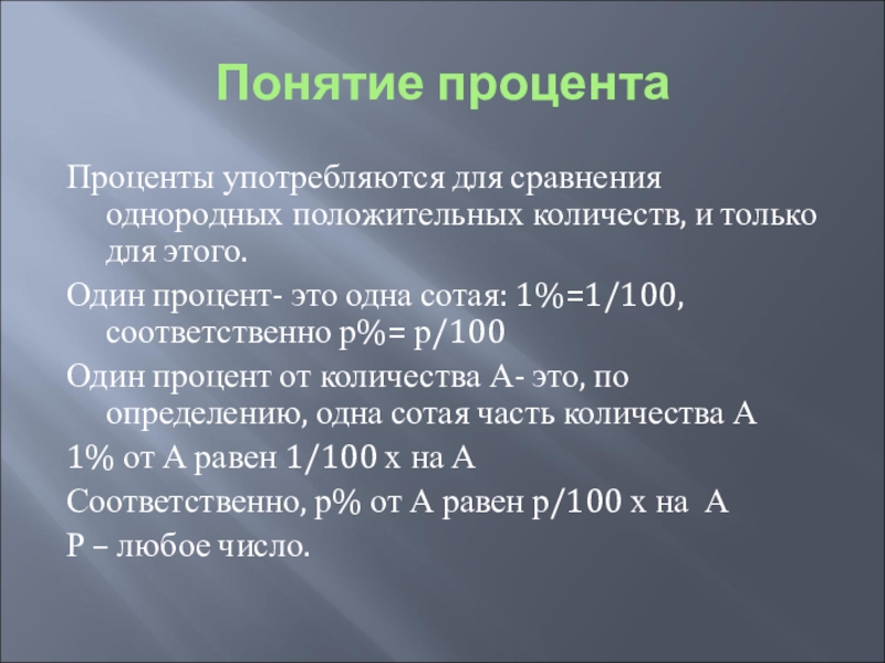 Долгое время под процентами понимались исключительно прибыль или убыток на каждые сто рублей. Они применялись только в торговых и денежных сделках. Затем область их применения расширилась, проценты встречаются в хозяйственных и финансовых расчетах, статистике, науке и технике. Ныне процент – это частный вид десятичных дробей, сотая доля целого (принимаемого за единицу).