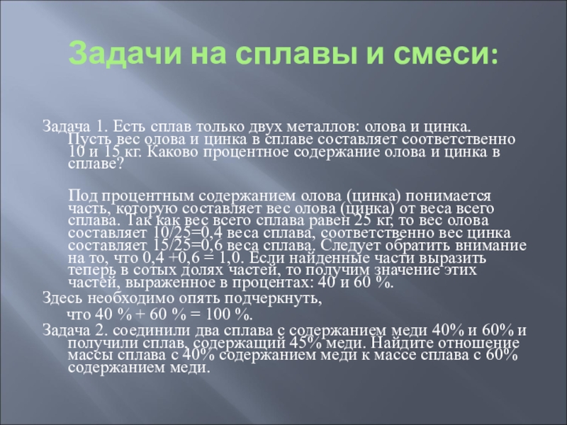 Под процентным содержанием олова (цинка) понимается часть, которую составляет вес олова (цинка) от веса всего сплава. Так как вес всего сплава равен 25 кг, то вес олова составляет 10/25=0,4 веса сплава, соответственно вес цинка составляет 15/25=0,6 веса сплава. Следует обратить внимание на то, что 0,4 +0,6 = 1,0. Если найденные части выразить теперь в сотых долях частей, то получим значение этих частей, выраженное в процентах: 40 и 60 %.
