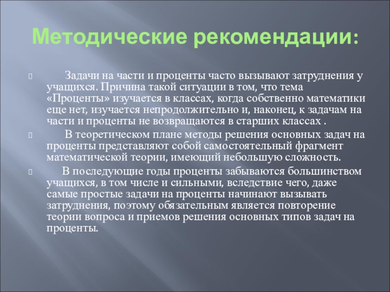 вызывают затруднения у учащихся. Причина такой ситуации в том, что тема «Проценты» изучается в классах, когда собственно математики еще нет, изучается непродолжительно и, наконец, к задачам на части и проценты не возвращаются в старших классах .