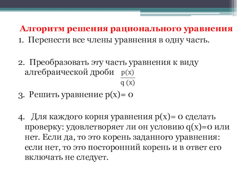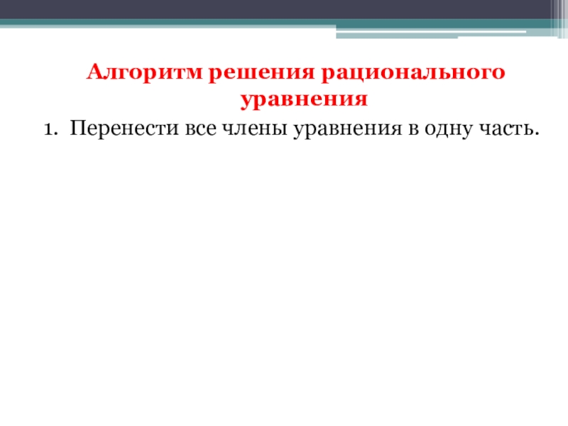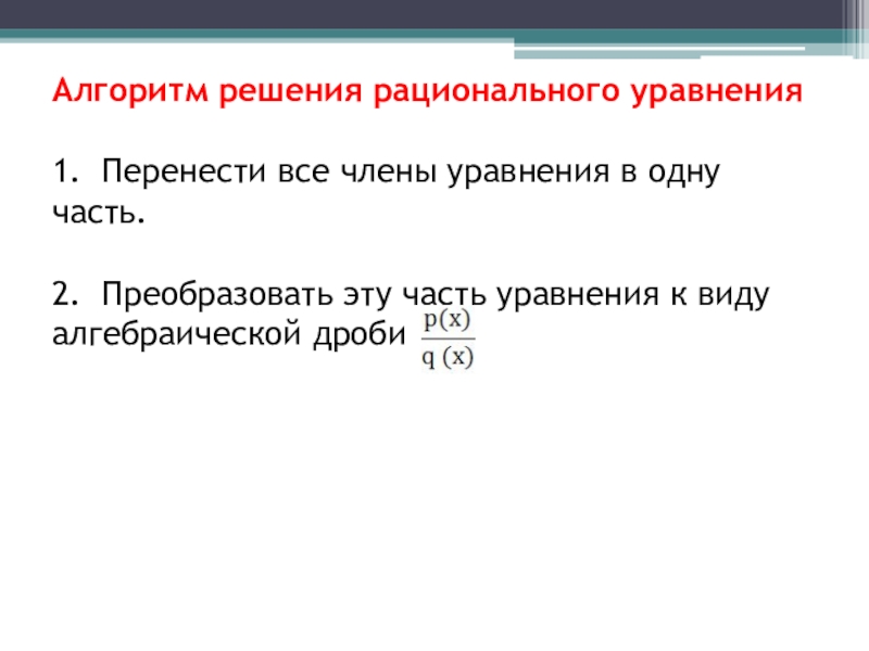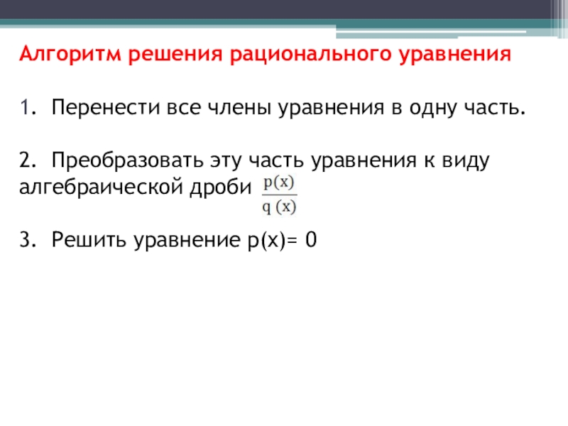 Алгоритм решения рационального уравнения1. Перенести все члены уравнения в одну часть.2. Преобразовать эту часть