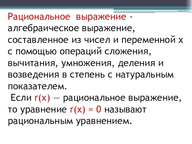 с помощью операций сложения, вычитания, умножения, деления и возведения в степень с натуральным показателем. Если r(х) — рациональное выражение, то уравнение r(х) = 0 называют рациональным уравнением.