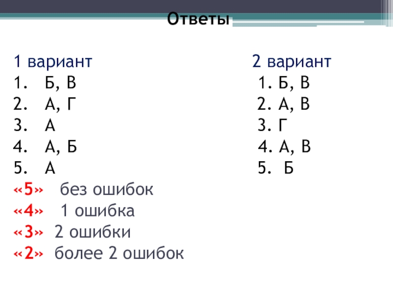 Ответы 1 вариант 2 вариант 1. Б, В 1. Б, В 2. А, Г 2. А, В 3. А 3. Г 4. А, Б 4. А, В 5. А 5. Б «5» без ошибок «4» 1 ошибка «3» 2 ошибки «2» более 2 ошибок