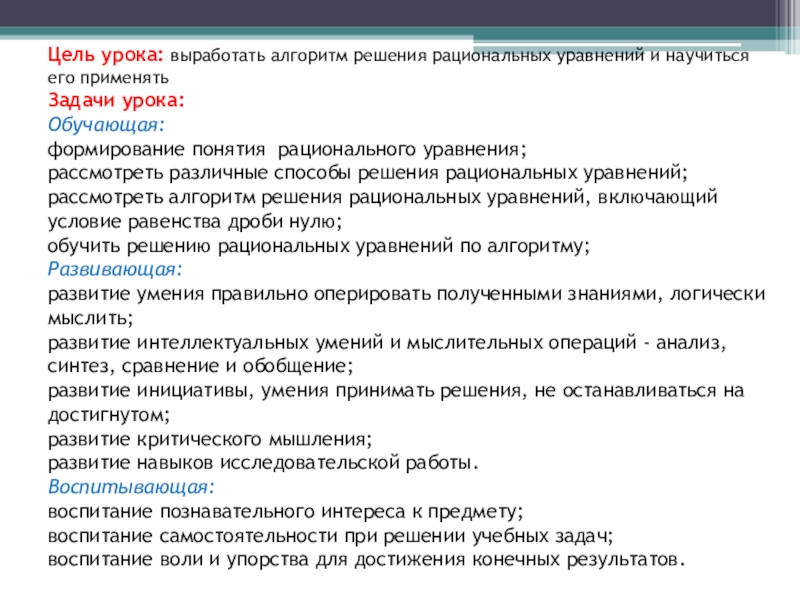 Задачи урока: Обучающая: формирование понятия рационального уравнения; рассмотреть различные способы решения рациональных уравнений; рассмотреть алгоритм решения рациональных уравнений, включающий условие равенства дроби нулю; обучить решению рациональных уравнений по алгоритму; Развивающая: развитие умения правильно оперировать полученными знаниями, логически мыслить; развитие интеллектуальных умений и мыслительных операций - анализ, синтез, сравнение и обобщение; развитие инициативы, умения принимать решения, не останавливаться на достигнутом; развитие критического мышления; развитие навыков исследовательской работы. Воспитывающая: воспитание познавательного интереса к предмету; воспитание самостоятельности при решении учебных задач; воспитание воли и упорства для достижения конечных результатов.