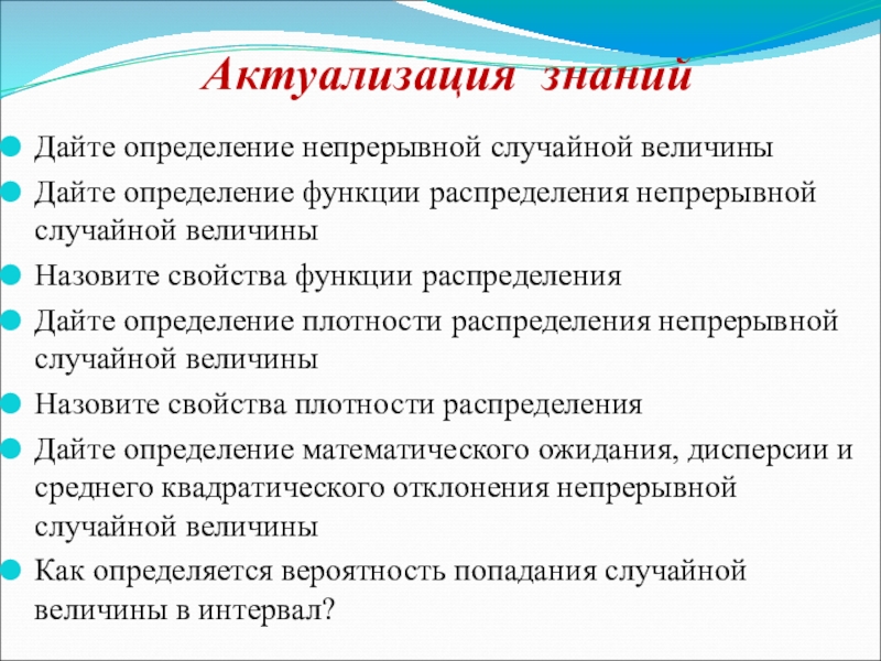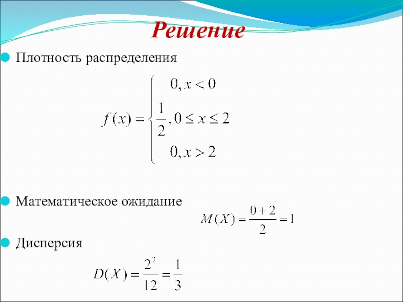 научить решать задачи на определение плотности распределения и характеристик равномерно распределенной случайной величины;