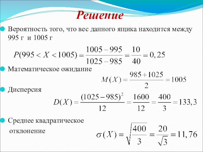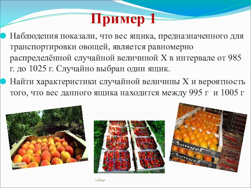 равномерно распределённой случайной величиной Х в интервале от 985 г. до 1025 г. Случайно выбран один ящик.