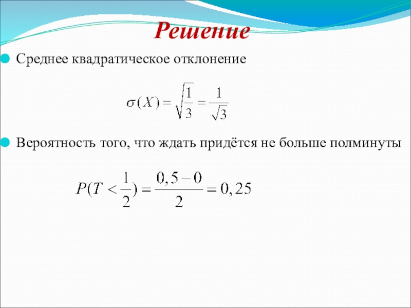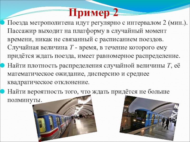на платформу в случайный момент времени, никак не связанный с расписанием поездов. Случайная величина T - время, в течение которого ему придётся ждать поезда, имеет равномерное распределение.