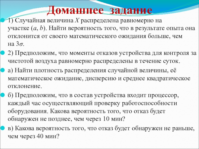 2) Предположим, что моменты отказов устройства для контроля за чистотой воздуха равномерно распределены в течение суток. Найти плотность распределения случайной величины, её математическое ожидание, дисперсию и среднее квадратическое отклонение.