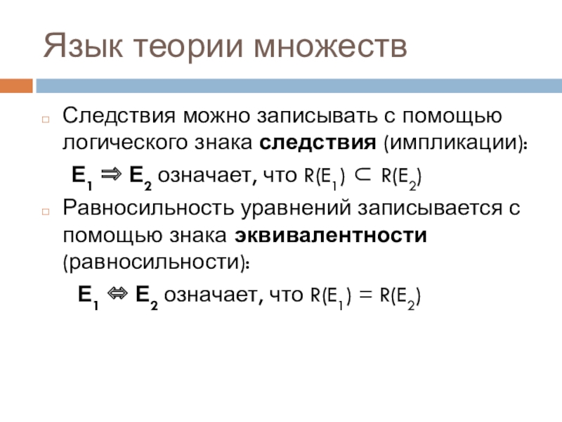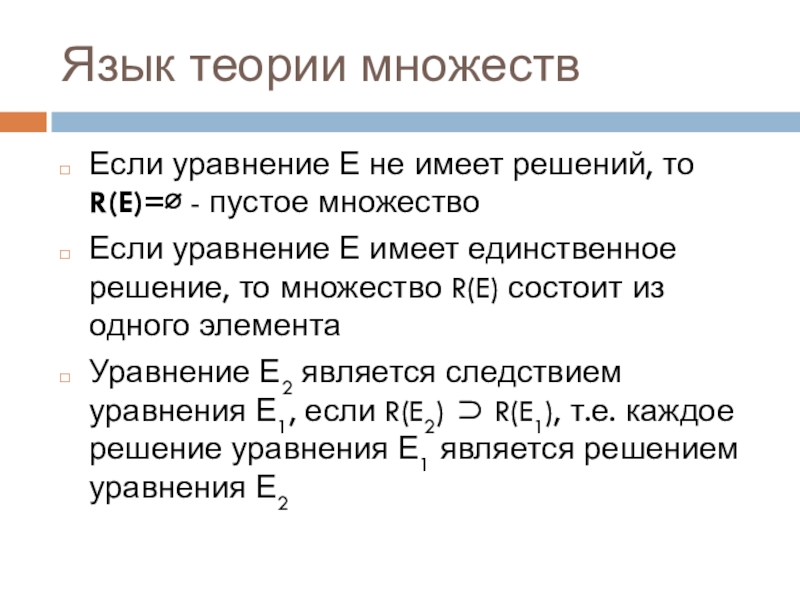 Уравнение Е2 является следствием уравнения Е1, если R(E2) R(E1), т.е. каждое решение уравнения Е1 является решением уравнения Е2
