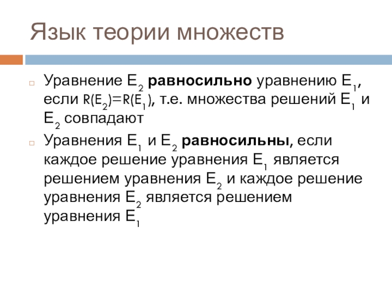 Уравнения Е1 и Е2 равносильны, если каждое решение уравнения Е1 является решением уравнения Е2 и каждое решение уравнения Е2 является решением уравнения Е1