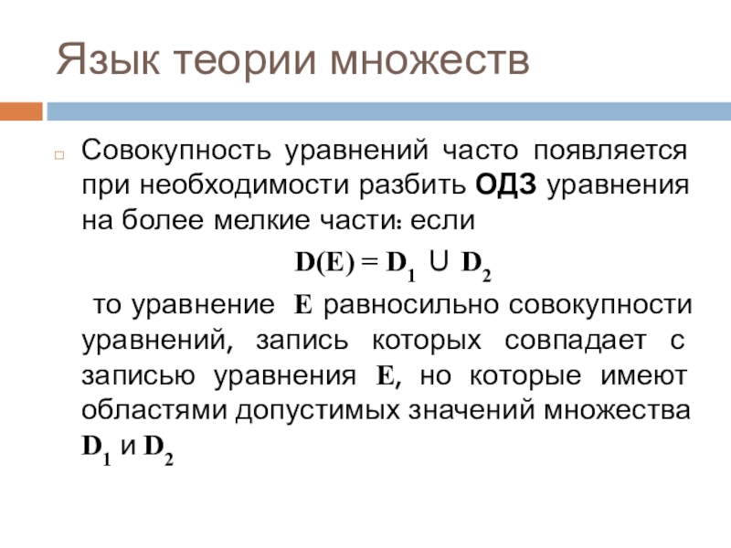 то уравнение Е равносильно совокупности уравнений, запись которых совпадает с записью уравнения Е, но которые имеют областями допустимых значений множества D1 и D2