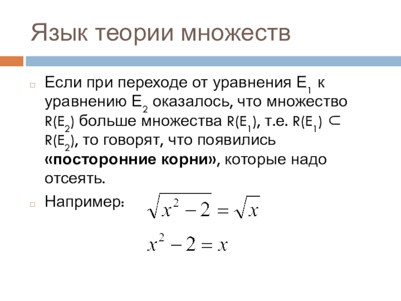 оказалось, что множество R(E2) больше множества R(E1), т.е. R(E1) R(E2), то говорят, что появились «посторонние корни», которые надо отсеять.