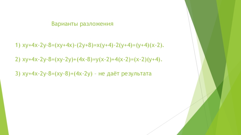 разложения 1) ху+4х-2у-8=(ху+4х)-(2у+8)=х(у+4)-2(у+4)=(у+4)(х-2). 2) ху+4х-2у-8=(ху-2у)+(4х-8)=у(х-2)+4(х-2)=(х-2)(у+4). 3) ху+4х-2у-8=(ху-8)+(4х-2у) – не даёт результата