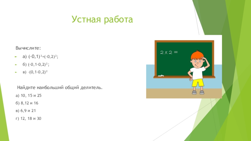 Устная работаВычислите:а) (-0,1)²+(-0,2)²;б) (-0,1-0,2)²;в) –(0,1-0,2)² Найдите наибольший общий делитель.а) 10, 15 и 25б) 8,12 и 16в) 6,9 и 21г) 12, 18 и 30