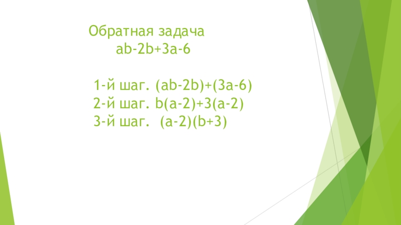ab-2b+3a-6 1-й шаг. (ab-2b)+(3a-6) 2-й шаг. b(a-2)+3(a-2) 3-й шаг. (a-2)(b+3)