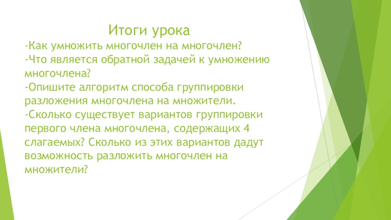 урока -Как умножить многочлен на многочлен? -Что является обратной задачей к умножению многочлена? -Опишите алгоритм способа группировки разложения многочлена на множители. -Сколько существует вариантов группировки первого члена многочлена, содержащих 4 слагаемых? Сколько из этих вариантов дадут возможность разложить многочлен на множители?