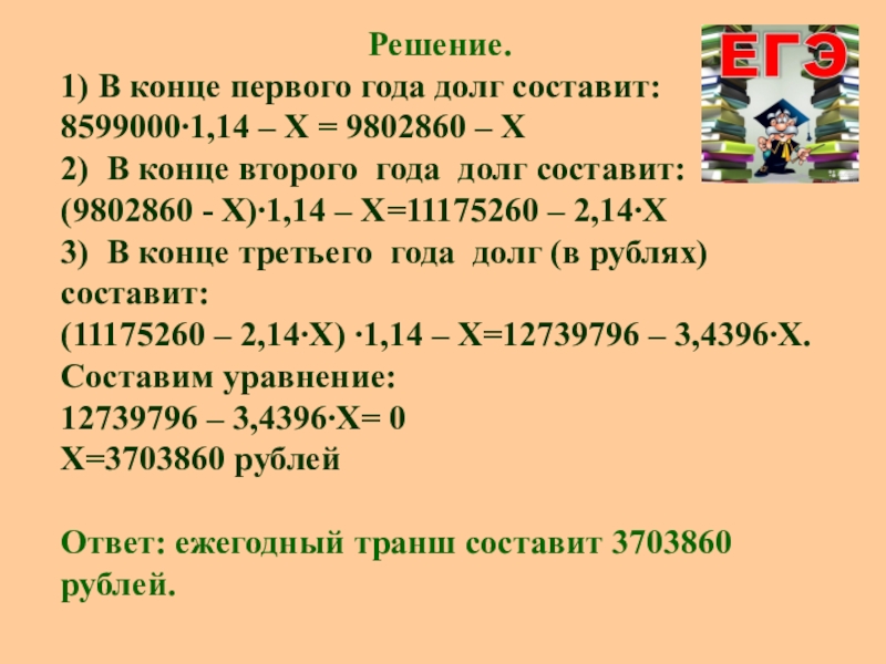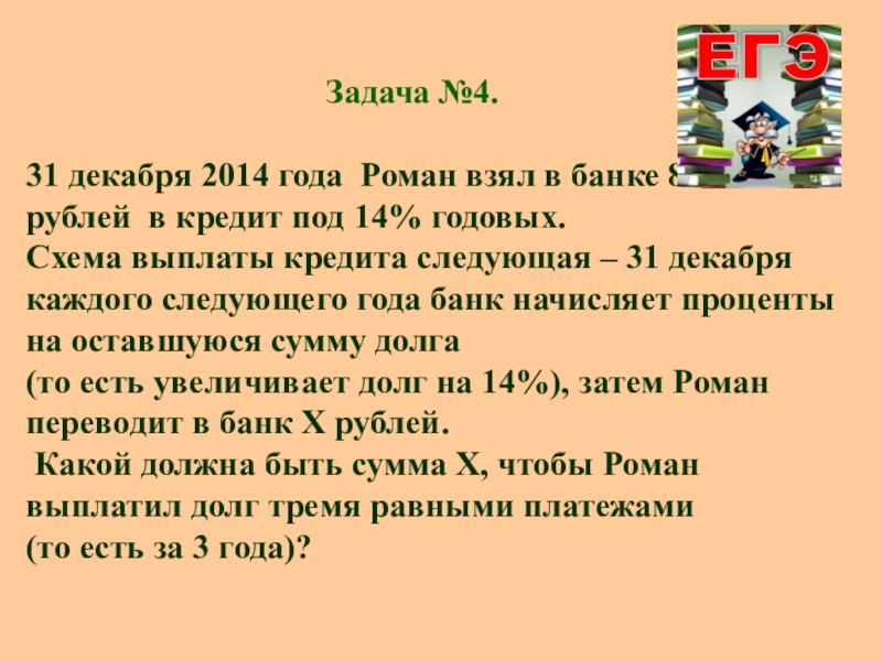 (то есть увеличивает долг на 14%), затем Роман переводит в банк Х рублей.