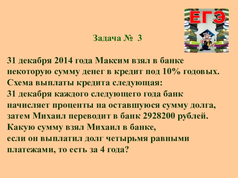 31 декабря каждого следующего года банк начисляет проценты на оставшуюся сумму долга, затем Михаил переводит в банк 2928200 рублей.