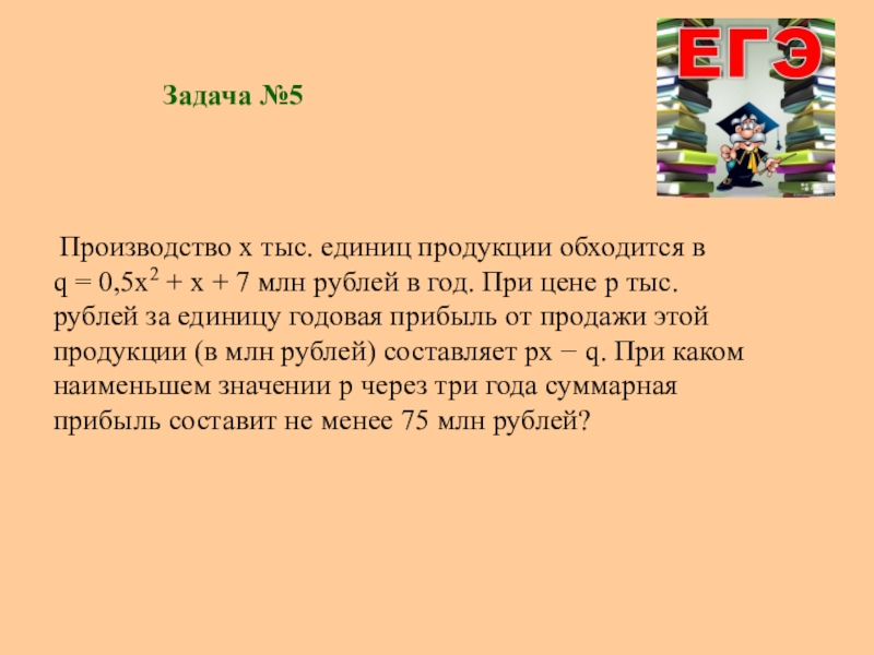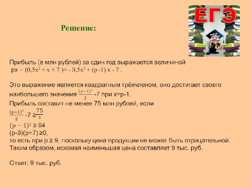 0,5x2 + x + 7 млн рублей в год. При цене p тыс. рублей за единицу годовая прибыль от продажи этой продукции (в млн рублей) составляет px − q. При каком наименьшем значении p через три года суммарная прибыль составит не менее 75 млн рублей?