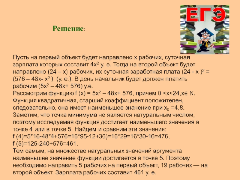 Их нужно распределить на день на два объекта. Если на первом объекте работает t человек, то их суточная зарплата составляет 4t2 у. е. Если на втором объекте работает t человек, то их суточная зарплата составляет t2 у. е. Как нужно распределить на эти объекты бригаду рабочих, чтобы выплаты на их суточную зарплату оказались наименьшими? Сколько у. е. в этом случае придется заплатить рабочим?